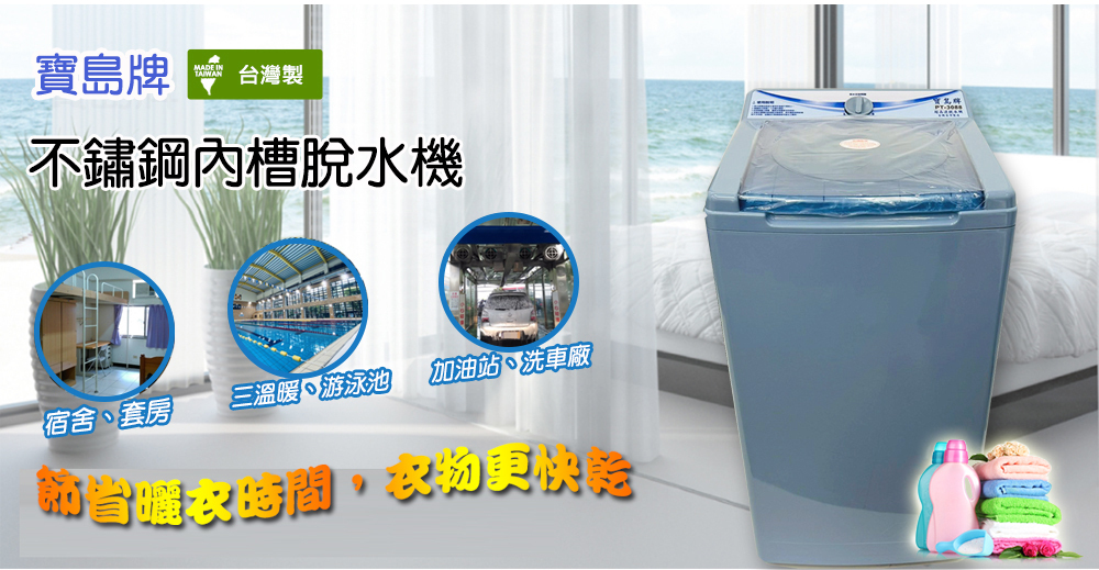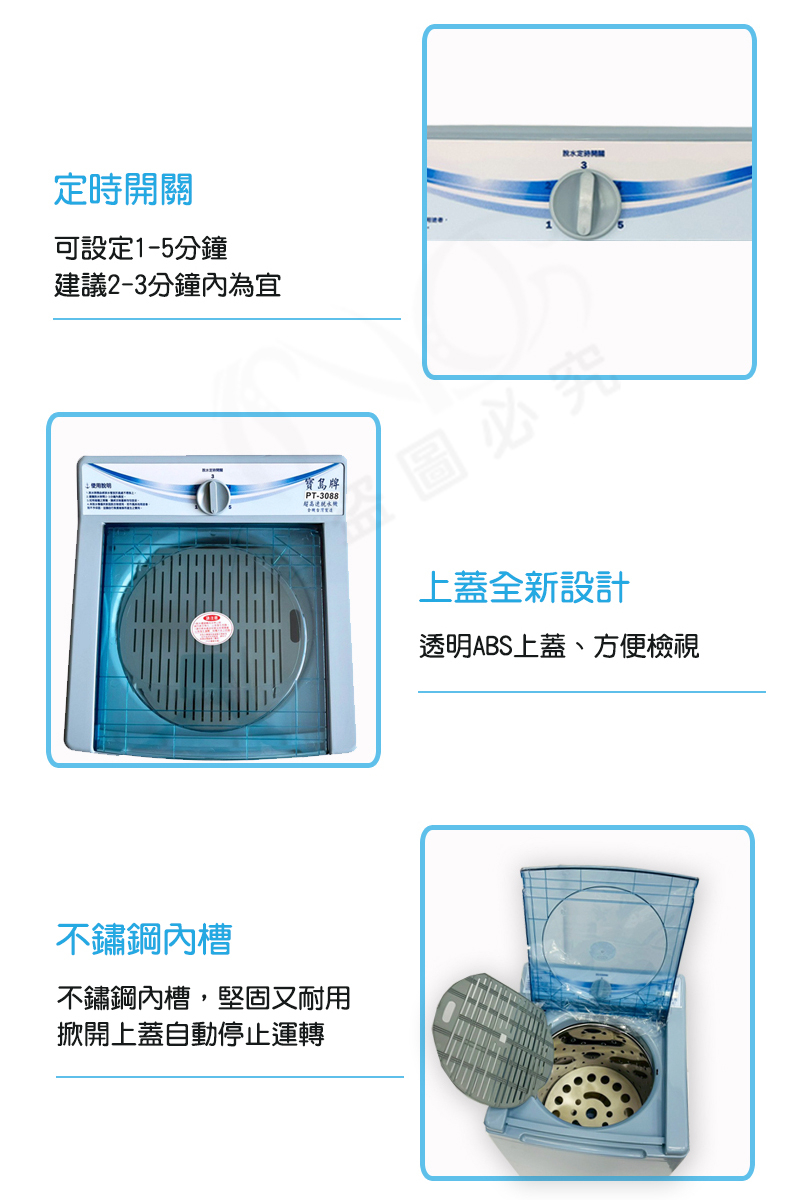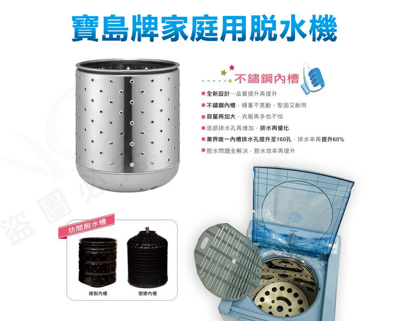 【寶島牌】10公斤不鏽鋼內槽高速脫水機 PT-3088*全新設計品質提升再提升*不鏽鋼內槽,穩重不晃動,堅固又耐用*容量再加大,衣服再多也不怕*底部排水孔再增加,排水再優化*內槽排水孔提升至160孔,排水率再提升60%*脫水問題全解決,脫水效率再提升*宿舍/家庭/游泳池/三溫暖等均適用,節省曬衣時間,衣物更快乾*定時5分鐘安全裝置*掀開上蓋自動停止運轉*台灣生產製造★請注意★此商品一年保固,若未依說明書指示使用~ 內容物為衣物以外商品, 若損壞故障皆不在保固範圍內!!